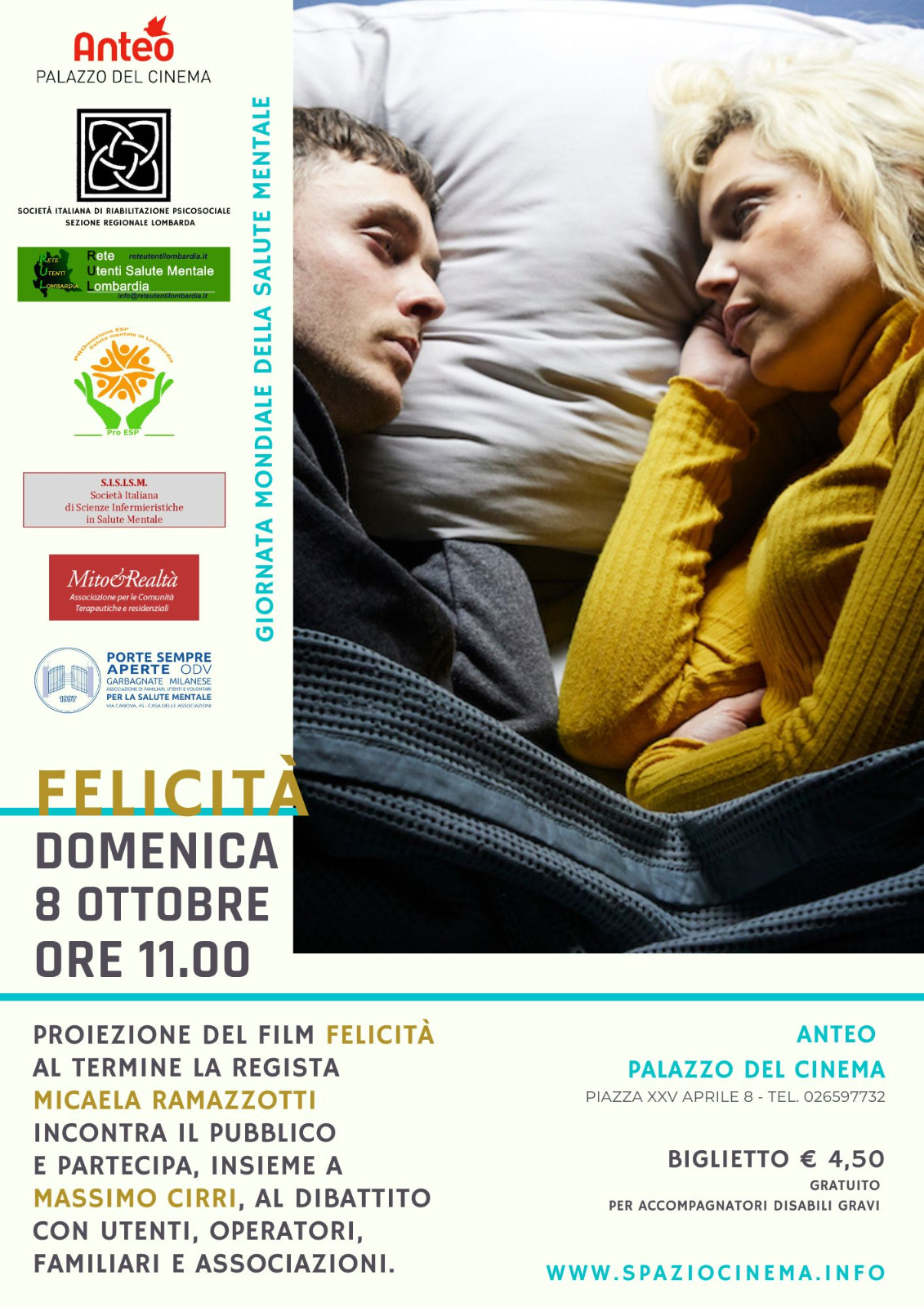 In occasione della giornata mondiale della salute mentale il Dott. Massimo Cirri e l’attrice e regista Micaela Ramazzotti, hanno partecipato al nutrito dibattito tenutosi presso la sala Astra del cinema Anteo di Milano, dopo la proiezione del film “Felicità” , condividendo il palco anche con Maria Rosa Santomauro, ESP di Cooperativa il Portico.
